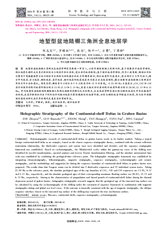 英国365集团公司官网邹志友博士联合研究团队,在《科学技术与工程》期刊上发表了题为“地堑型盆地陆棚三角洲全息地层学”的研究文章。该研究聚焦于地堑型盆地陆棚三角洲的全息地层学特征,主要研究内容及成果如下:
