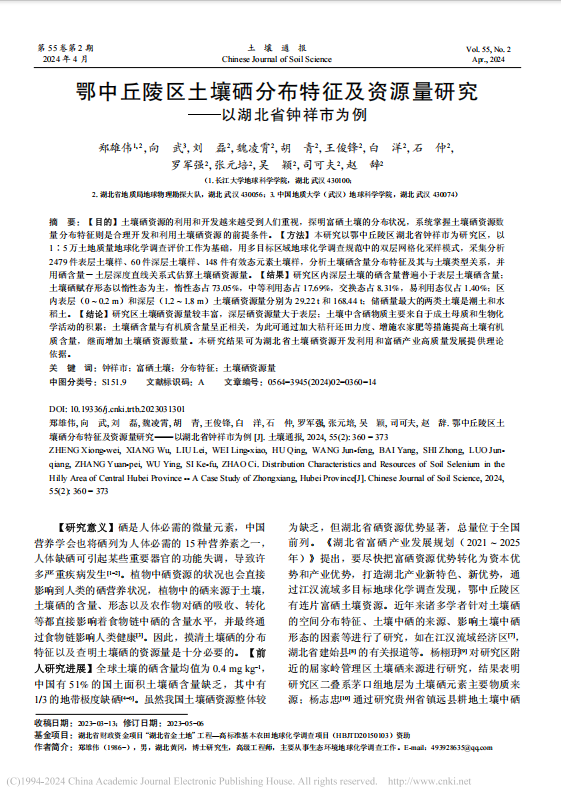 英国365集团公司官网博士生郑雄伟在《土壤通报》上发表题为“鄂中丘陵区土壤硒分布特征及资源量研究−以湖北省钟祥市为例”的研究论文。该论文选取鄂中丘陵区湖北省钟祥市西北部地区为研究对象,采用多目标区域地球化学调查规范中所采用的双层网格化模式采样,测定包括硒在内的土壤各类元素等30项指标,通过单位土壤硒含量揭示土壤硒的分布特征、硒的来源及影响因素,对湖北省土壤硒资源开发利用和富硒产业高质量发展有着重要的实际意义。