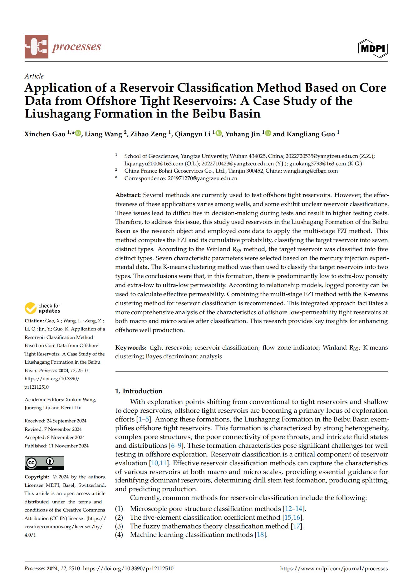 英国365集团公司官网22级博士研究生在期刊《Processes》上发表题为“Application of a Reservoir Classification Method Based on CoreData from Offshore Tight Reservoirs: A Case Study of theLiushagang Formation in the Beibu Basin”的研究论文。英国365集团公司官网为论文第一署名单位,高昕晨为第一通讯作者。