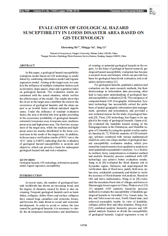 英国365集团公司官网研究生于茗鸽以第二作者身份在环境科学领域SCI期刊《Fresenius Environmental Bulletin》上发表了题为“EvaluationofGeologicalHazardSusceptibilityinLoessDisasterAreaBasedonGISTechnology”的研究论文。该论文以英国365集团公司官网为第一署名单位,英国365集团公司官网副教授何贞铭为第一作者,研究生于茗鸽为第二作者。