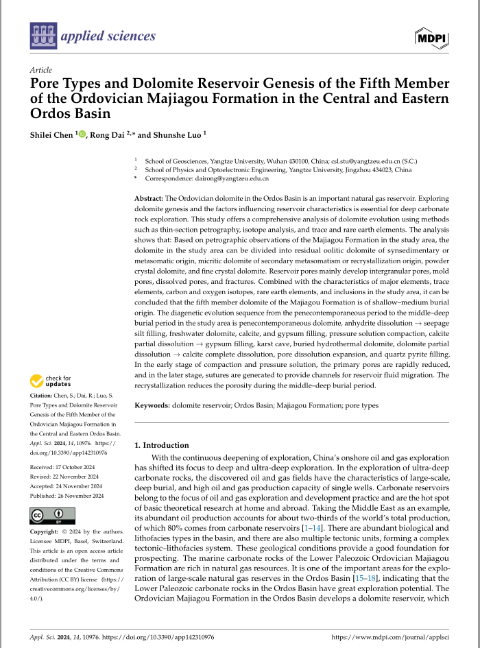 地科公司博士生陈世磊在《Applied Sciences》上发表题为“Pore Types and Dolomite Reservoir Genesis of the Fifth Member of the Ordovician Majiagou Formation in the Central and Eastern Ordos Basin”的研究论文。文章综合运用铸体薄片、碳酸盐岩碳氧同位素、、阴极发光、微量元素、稀土元素及流体包裹体等分析测试方法,并结合构造背景、沉积微相及成岩作用等资料,深入剖析白云岩的成因机理。分析表明,(1)受到海平面升降和中央古隆起的阻挡作用控制,研究区内奥陶系马家沟组五段膏盐下白云岩储层在短期海退和短期海进具有明显的差别,纵向上具有旋回性,依据研究区内大量马家沟组白云岩薄片镜下观察鉴定结果,研究区内白云岩可分为同沉积或交代成因的残余鲕粒白云岩,次生交代或重结晶成因的泥晶白云岩,粉晶白云岩和细晶白云岩。储层孔隙主要发育晶间孔、铸模孔、溶孔和裂缝。(2)马家沟组五段白云岩主要由准同生白云岩、埋藏白云岩及热液白云岩组成。根据地球化学特征结合岩石学特征,确定马家沟组五段白云石Sr含量平均值为407.3×10-6,具有低Fe、低Mn、高Sr、高Na的特点,稀土元素含量为0.01×10-6-21.8×10-6,具有典型碳酸盐岩低稀土元素含量特征,δ13C的含量介于-2‰-2‰之间δ18O的含量介于-12‰到-4‰之间,说明其成岩环境为埋藏环境。(3)研究区内从准同生期到中-深埋藏期的成岩演化序列为:准同生白云石化、硬石膏溶解→渗流粉砂充填、淡水白云化、方解石和石膏充填、压溶压实作用、方解石部分溶解→石膏充填、溶缝溶孔溶洞、埋藏热液白云化、白云石部分溶蚀→方解石完全溶蚀、孔隙溶蚀扩大、石英黄铁矿充填。其中压实压溶作用早期使原生孔隙迅速减少,后期则产生缝合线等为储层流体运移提供通道;重结晶作用则在中-深埋藏期使孔隙减少。
