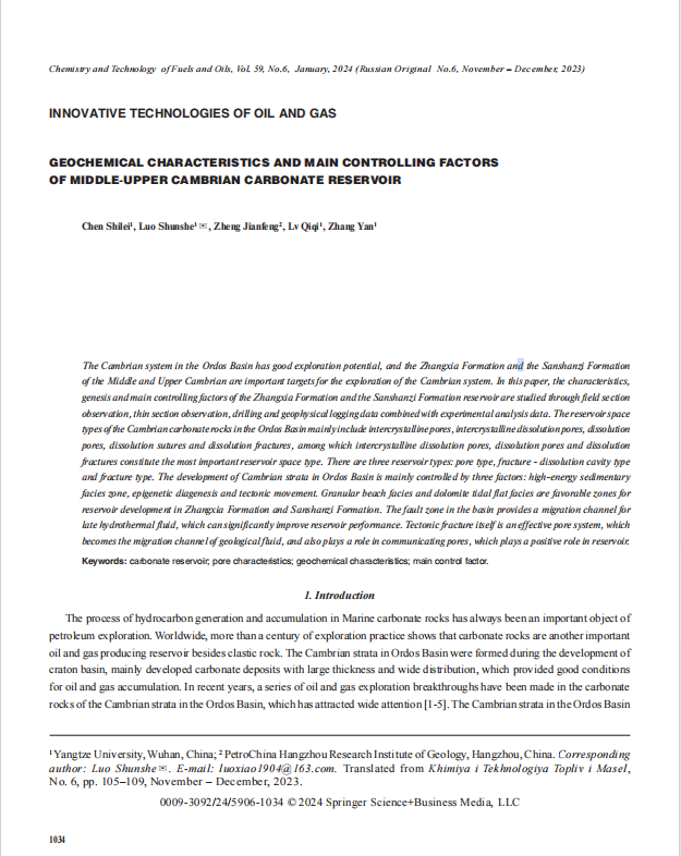 地科公司博士生陈世磊在《Chemistry and Technology of Fuels and Oils》上发表题为“GEOCHEMICAL CHARACTERISTICS AND MAIN CONTROLLING FACTORS OF MIDDLE-UPPER CAMBRIAN CARBONATE RESERVOIR”的研究论文。该论文介绍了鄂尔多斯盆地寒武系具有良好的勘探潜力,张夏组和三山子组中上寒武是寒武系勘探的重要目标。通过野外剖面研究了张夏组和三山子组储层的成因及主要控制因素通过薄片观察、钻井和地球物理测井数据与实验分析数据相结合。鄂尔多斯盆地寒武系碳酸盐岩孔隙类型主要包括晶间孔隙、晶间溶蚀孔隙、溶蚀孔隙、溶蚀缝和溶蚀裂缝,其中晶间溶蚀孔隙、溶蚀孔隙和溶蚀