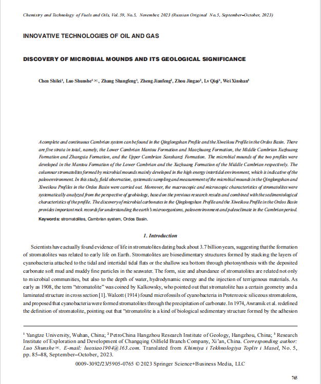 地科公司博士生陈世磊在《Chemistry and Technology of Fuels and Oils》上发表题为“DISCOVERY OF MICROBIAL MOUNDS AND ITS GEOLOGICAL SIGNIFICANCE”的研究论文。该论文,以鄂尔多斯盆地寒武系青龙山剖面和西磑口剖面叠层石为研究对象,对青龙山剖面以及西磑口剖面沉积构造特征进行观察和测量。