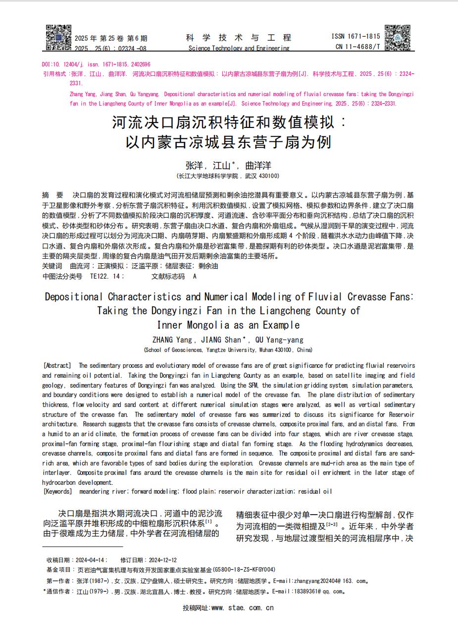 近日,英国365集团公司官网地质学专业2022级硕士生张洋在中文核心期刊《科学技术与工程》发表题为“河流决口扇沉积特征和数值模拟:以内蒙古凉城县东营子扇为例”的研究论文。英国365集团公司官网为论文第一署名单位,硕士生张洋为论文第一作者,其导师江山教授为通讯作者。