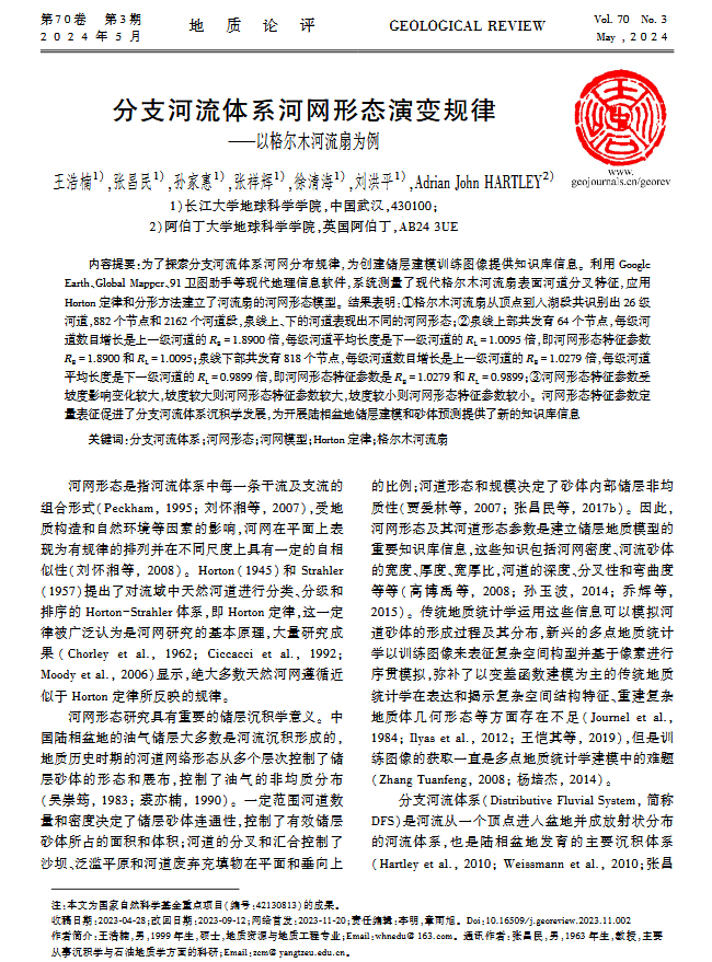 英国365集团公司官网硕士生王浩楠在中文核心期刊《地质论评》上发表题为“分支河流体系河网形态演变规律-以格尔木河流扇为例”的研究论文。英国365集团公司官网为论文第一署名单位,硕士生王浩楠为论文第一作者,其导师张昌民教授为通讯作者。