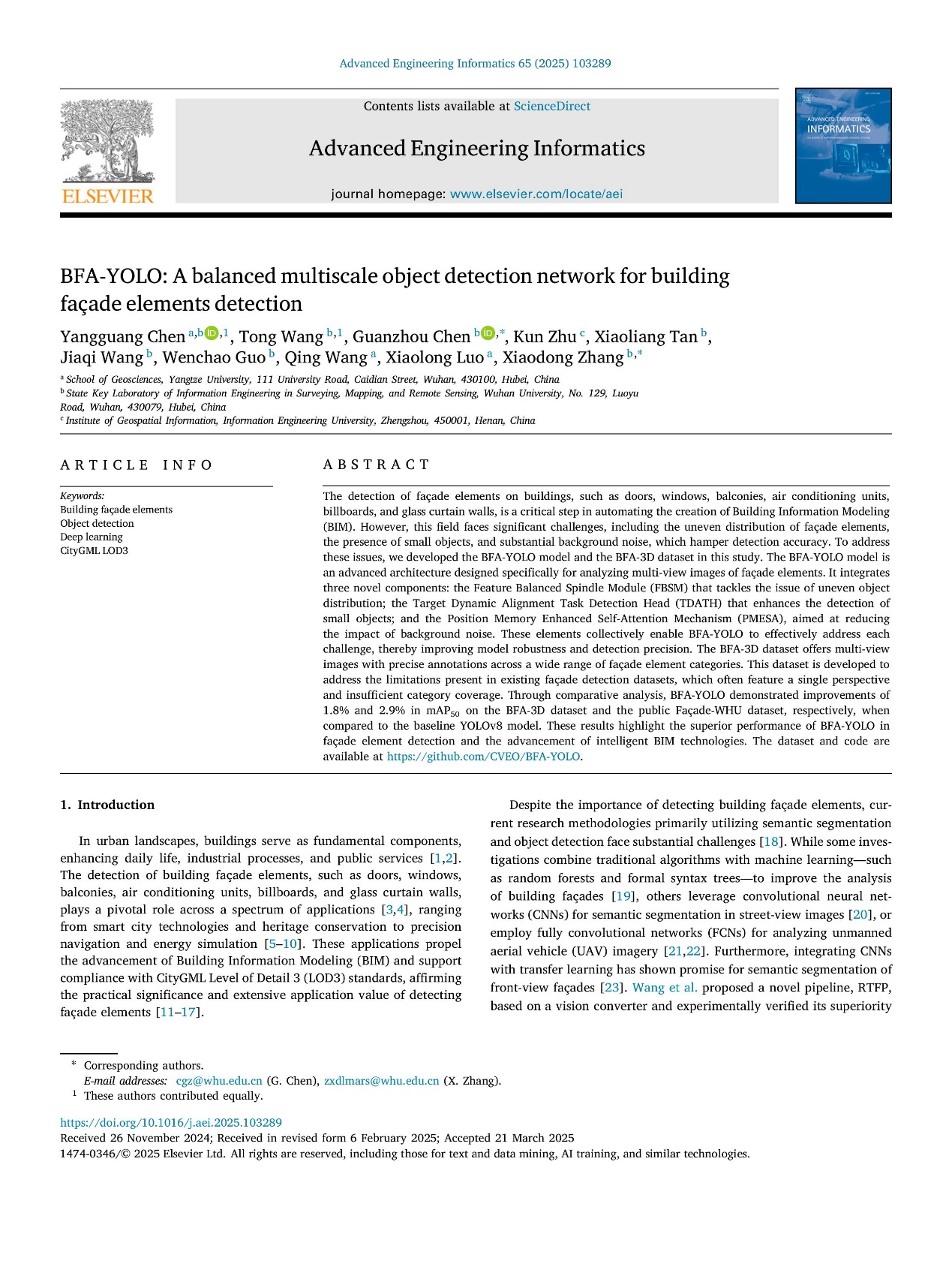 地科公司硕士生陈阳光在人工智能领域顶刊《Advanced Engineering Informatics》发表题目为“BFA-YOLO: A balanced multiscale object detection network for building façade elements detection”的研究论文(Sci一区Top,CCF-B,影响因子8.0)。英国365集团公司官网为论文第一署名单位,硕士研究生陈阳光为论文第一作者,其导师罗小龙副教授为共同作者,公司兼职硕士生导师张晓东教授为通讯作者。