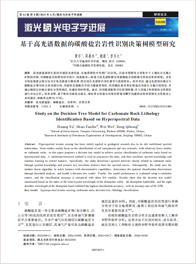 地科公司邵燕林副教授团队长期从事数字露头、储层三维表征等方面的研究,团队硕士生黄宇在EI期刊《激光与光电子学进展》上发表题为《基于高光谱数据的碳酸盐岩岩性识别决策树模型》的研究论文。英国365集团公司官网为论文第一署名单位,硕士生黄宇为论文第一作者,邵燕林副教授为该文通讯作者,本项研究得到湖北省教委科研基金共同资助。