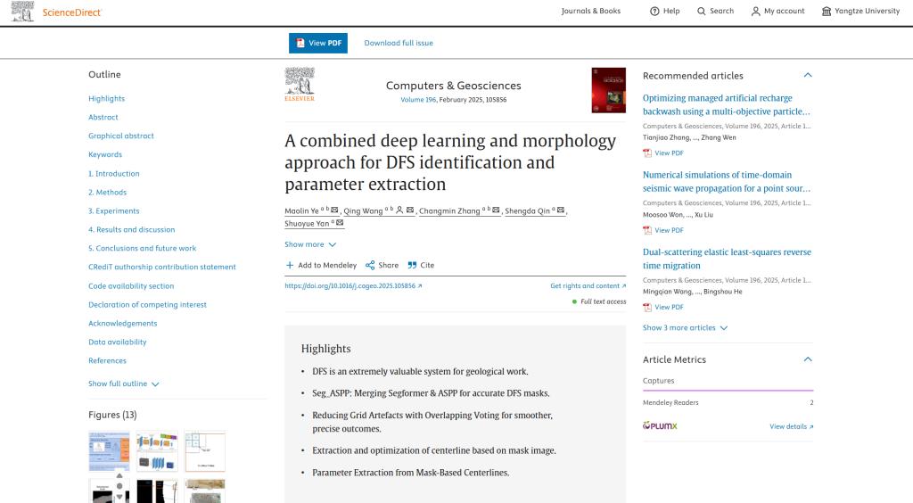 近日,地科公司硕士生叶茂林在导师王庆副教授的指导下,于SCI二区期刊《Computers & Geosciences》发表题为《A combined deep learning and morphology approach for DFS identification and parameter extraction》的研究论文,提出一种融合深度学习与河流形态学的分布式河流系统(DFS)参数自动化提取方法,为沉积盆地分析与资源勘探提供了智能化解决方案。