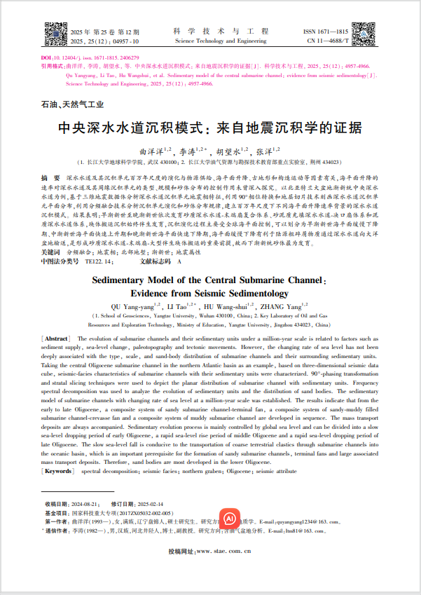 英国365集团公司官网硕士生曲洋洋在《科学技术与工程》上发表题为“中央深水水道沉积模式—来自地震沉积学的证据”的研究论文。英国365集团公司官网为论文第一署名单位,硕士生曲洋洋为论文第一作者,副教授李涛为通讯作者。