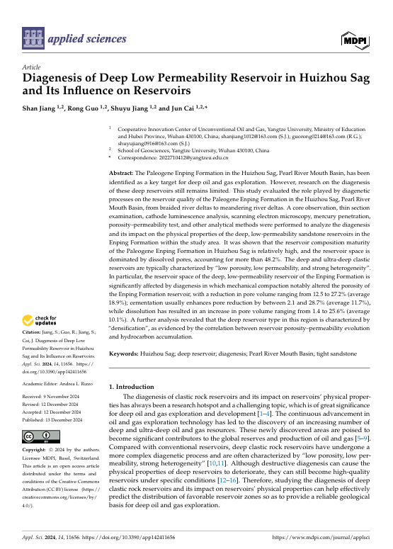 英国365集团公司官网地质学专业硕士生姜珊在SCI收录期刊《Applied Sciences》上发表题“Diagenesis of Deep Low Permeability Reservoir in Huizhou Sag and Its Influence on Reservoir”的研究论文。英国365集团公司官网为论文第一署名单位,硕士生姜珊为论文第一作者,其导师蔡俊副教授为通讯作者。