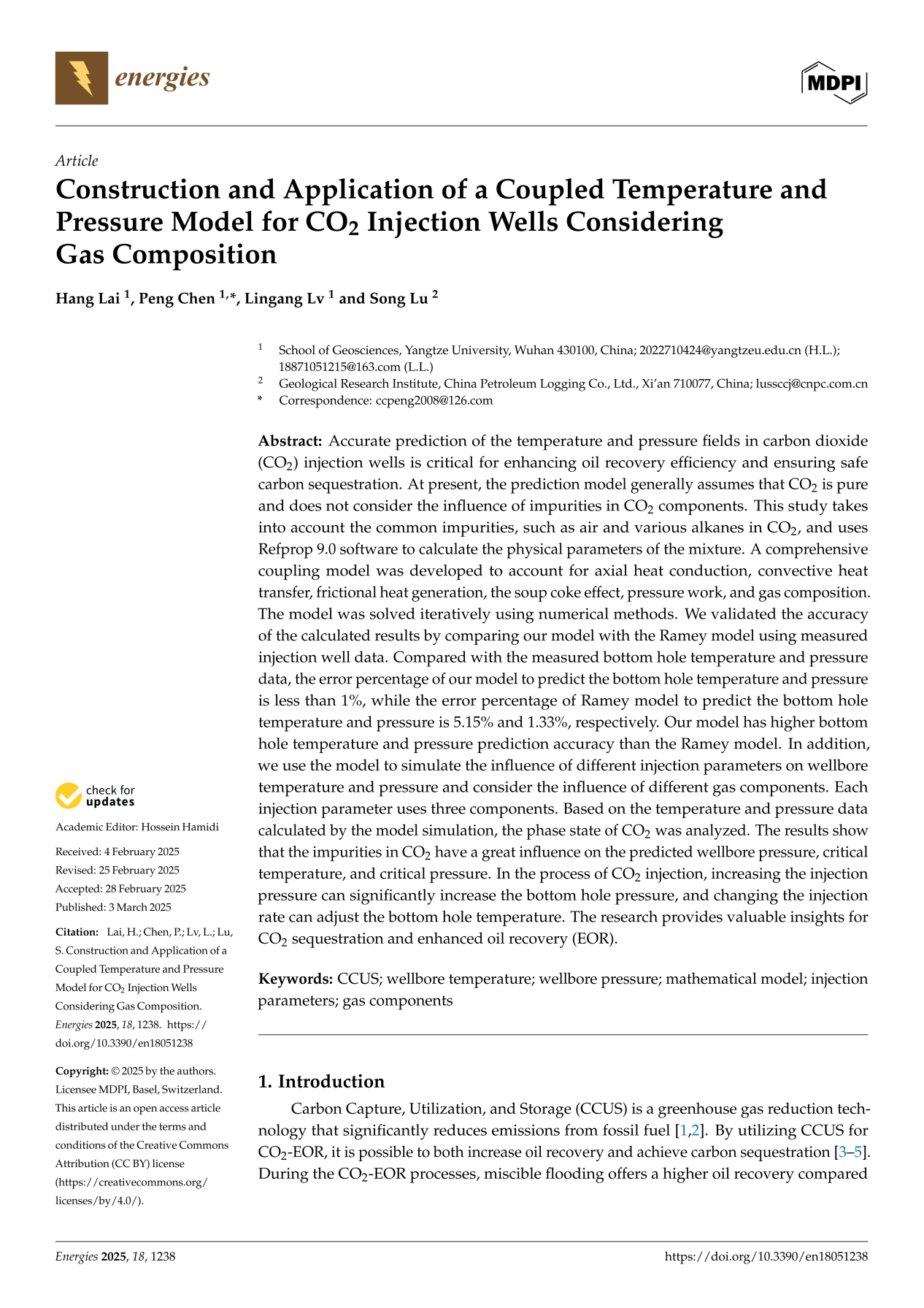 英国365集团公司官网硕士生来航在SCI收录期刊《Energies》发表题为“Construction and Application of a Coupled Temperature and Pressure Model for CO2Injection Wells Considering Gas Composition”的研究论文。英国365集团公司官网为论文第一署名单位,硕士生来航为论文第一作者,教师陈鹏为通讯作者。