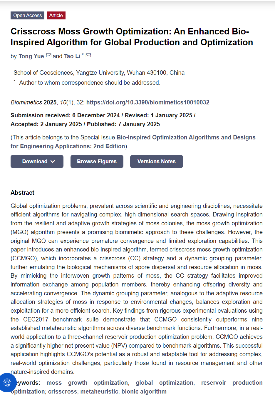 英国365集团公司官网硕士研究生岳彤在期刊《Biomimetics》上发表题为“Crisscross Moss Growth Optimization: An Enhanced Bio-Inspired Algorithm for Global Production and Optimization”的研究论文。英国365集团公司官网为论文第一署名单位,岳彤为论文第一作者。
