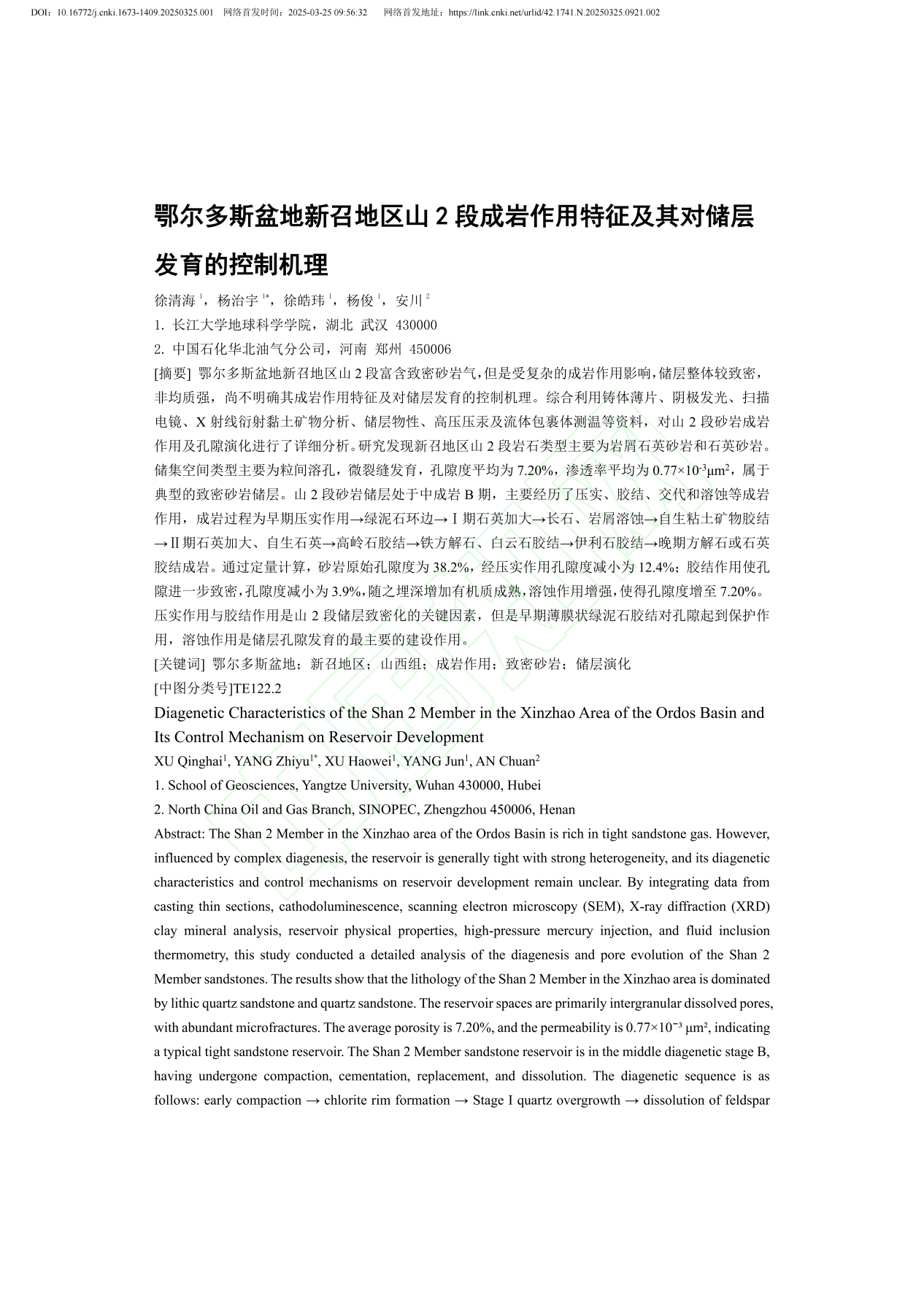 英国365集团公司官网硕士生杨治宇在《英国365集团公司官网学报》上发表题为“鄂尔多斯盆地新召地区山2段成岩作用特征及其对储层发育的控制机理”的研究论文,英国365集团公司官网为论文第一署名单位,徐清海副教授与杨治宇为共同第一作者。