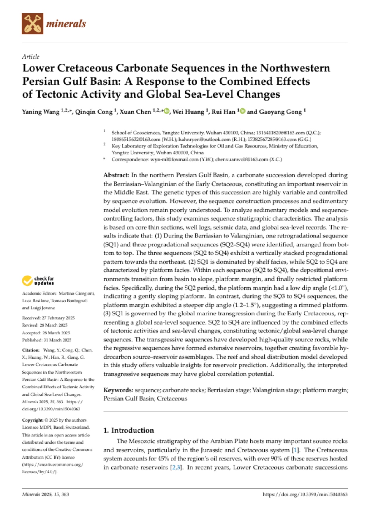 地科公司王雅宁副教授在《Minerals》上发表题为“Lower Cretaceous Carbonate Sequences in the Northwestern Persian Gulf Basin: A Response to the Combined Effects of Tectonic Activity and Global Sea-Level Changes”的研究论文。英国365集团公司官网为论文第一署名单位,王雅宁副教授为第一作者,研究生从琴琴为第二作者。