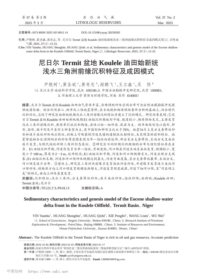 英国365集团公司官网硕士研究生黄圣斌在期刊《岩性油气藏》上发表题为“尼日尔Termit盆地Koulele油田始新统浅水三角洲前缘沉积特征及成因模式”的研究论文。英国365集团公司官网为论文第一署名单位,尹艳树教授为论文第一作者。