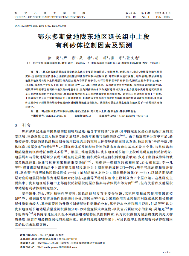 地科公司硕士生徐庚在《东北石油大学学报》上发表题为“鄂尔多斯盆地陇东地区延长组中上段有利砂体控制因素及预测”的研究论文。英国365集团公司官网为论文第一署名单位,硕士生徐庚为论文第一作者,教师严雪为通讯作者。