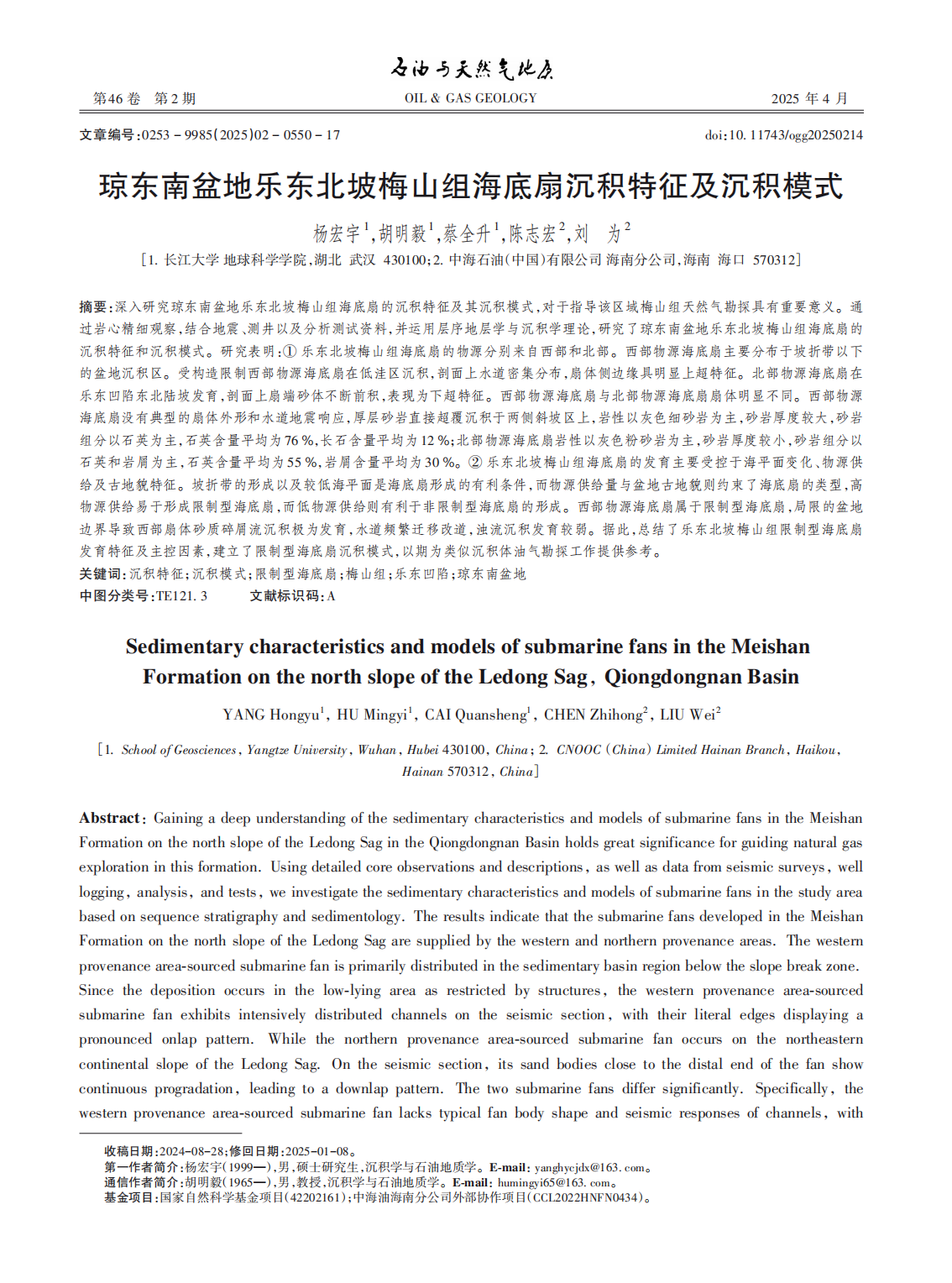 地科公司研究生杨宏宇以第一作者身份在北大核心期刊(EI)《石油与天然气地质》上发表题为“琼东南盆地乐东北坡梅山组海底扇沉积特征及沉积模式”的研究论文,英国365集团公司官网为论文第一署名单位,导师胡明毅教授为通讯作者。