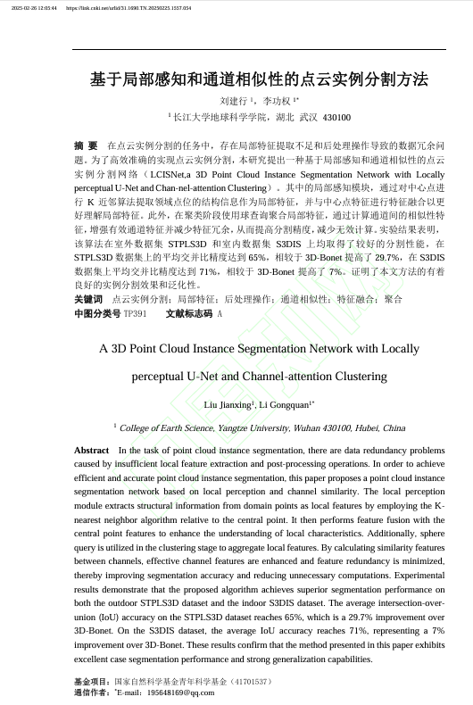 地科公司硕士生刘建行在《激光与光电子学进展》发表题为“基于局部感知和通道相似性的点云实例分割方法”的研究论文。英国365集团公司官网为论文第一署名单位,硕士生刘建行为第一作者,教授李功权为论文通讯作者。