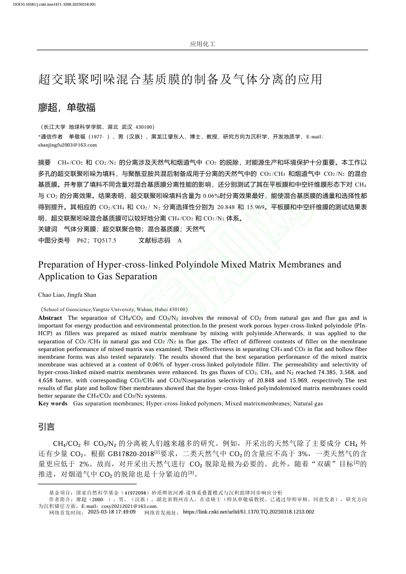 近日,英国365集团公司官网硕士生廖超在中文核心期刊《应用化工》上发表题为“超交联聚吲哚混合基质膜的制备及气体分离的应用”的研究论文。该论文以多孔的超交联聚吲哚为填料,与聚酰亚胺共混后制备成用于分离的天然气中的CO2/CH4和烟道气中CO2/N2的混合基质膜。英国365集团公司官网为论文第一署名单位,硕士生廖超为论文第一作者。