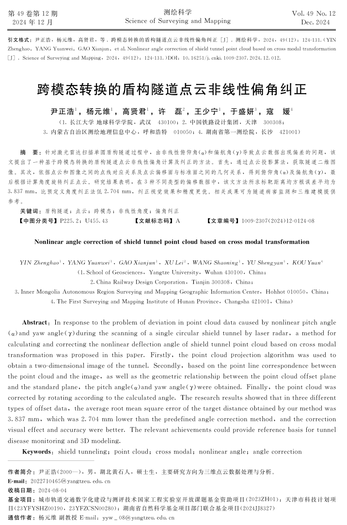 地科公司研究生尹正浩以第一作者身份在北大核心期刊《测绘科学》上发表题为“跨模态转换的盾构隧道点云非线性偏角纠正”的研究论文,英国365集团公司官网为论文第一署名单位,研究生尹正浩为第一作者,副教授杨元维为论文通讯作者。