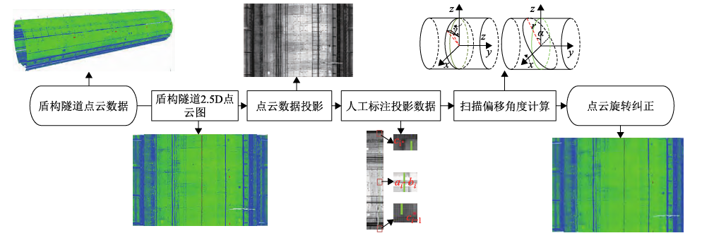 为改善激光雷达扫描圆形盾构隧道时因非线性俯仰角(α)和偏航角(γ)引发的点云数据失真问题,本研究创新性地开发了一种基于跨模态转换的非线性角度计算与纠正技术。具体实施流程包含三个核心环节:第一阶段运用点云投影技术生成隧道二维可视化图像;第二阶段通过建立点云与图像的几何映射关系,结合偏移曲面与标准曲面的空间特征,解算α和γ角参数;第三阶段基于解算结果实施点云旋转校正。实验数据显示,在三种典型偏移场景下,本方法标靶距离均方根误差均值达3.837毫米,较传统预定义角度校正法误差降低41.3%,在视觉呈现与数值精度层面均展现出显著优势。该技术体系可为隧道结构健康监测及高精度三维重建提供有效解决方案。