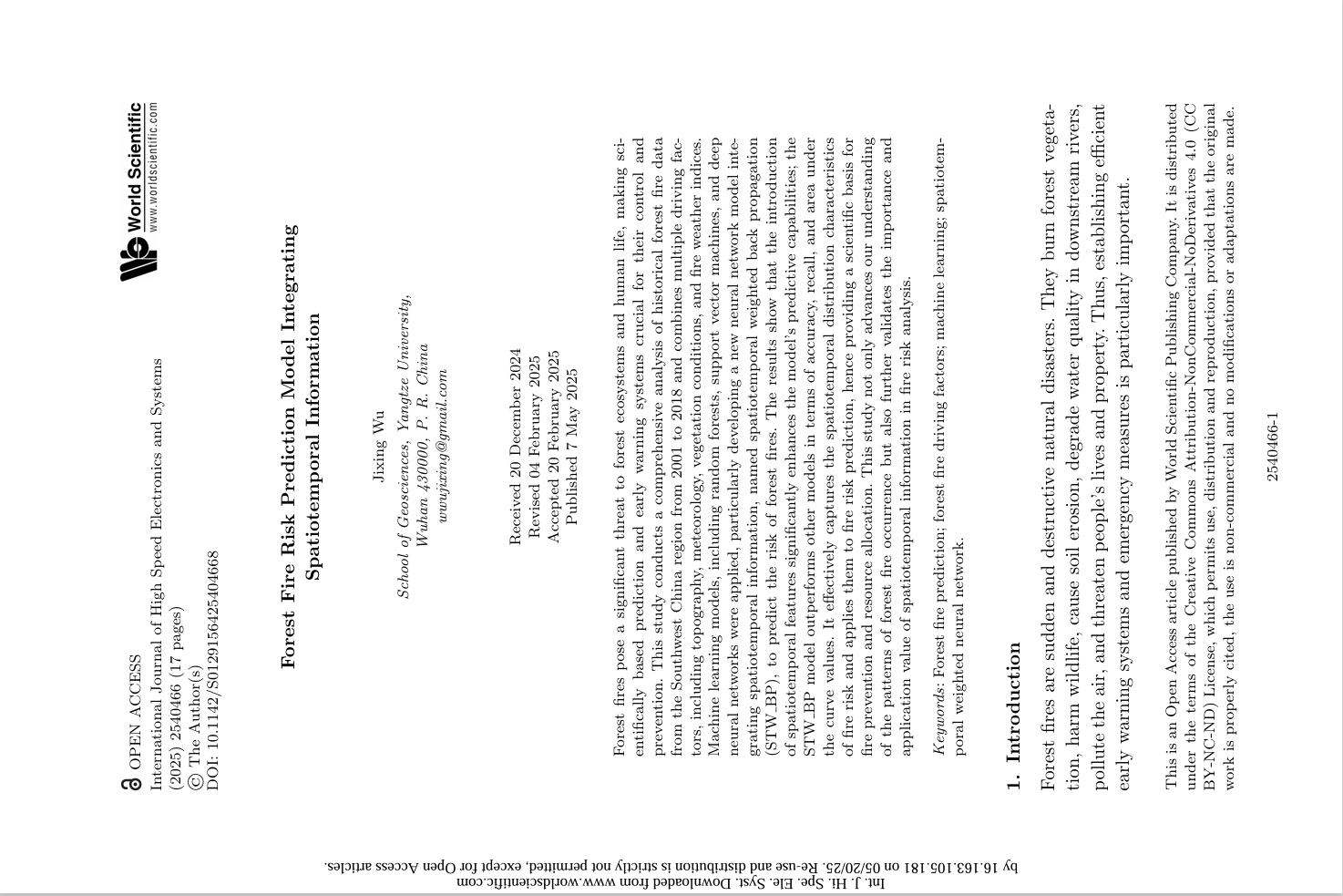 英国365集团公司官网硕士生吴集星在EI收录期刊《International Journal of High Speed Electronics and Systems》上发表题为“Forest Fire Risk Prediction Model Integrating Spatiotemporal Information”的研究论文。英国365集团公司官网为论文第一署名单位,吴集星为论文第一作者。