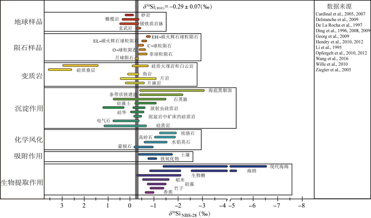 前人在地质样品Si同位素分析方面开展了大量工作。从建立研究方法到分析不同类型地质样品的Si同位素组成,再到探讨Si同位素组成与地球演化、大陆地壳生长等地质过程的关系,明确了不同地质样品中Si同位素的组成(图3)。