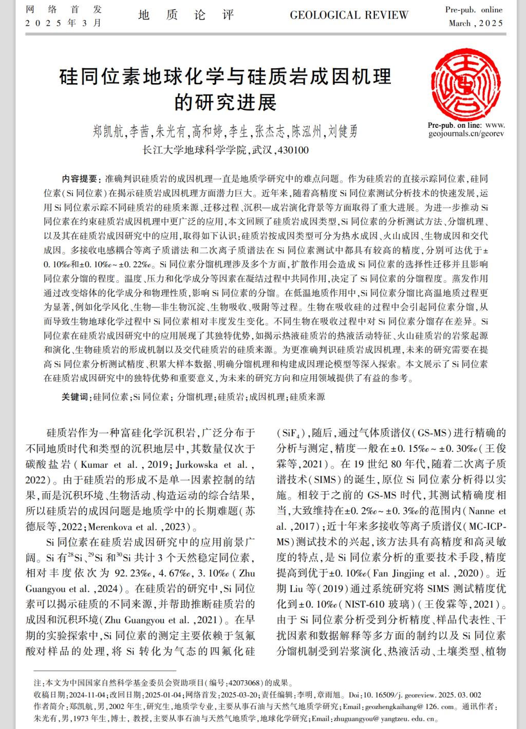 近日,英国365集团公司官网地质学专业2024级硕士生郑凯航在中文核心期刊《地质论评》发表题为“硅同位素地球化学与硅质岩成因机理的研究进展”的研究论文。英国365集团公司官网为论文第一署名单位,硕士生郑凯航为论文第一作者,其导师朱光有教授为通讯作者。