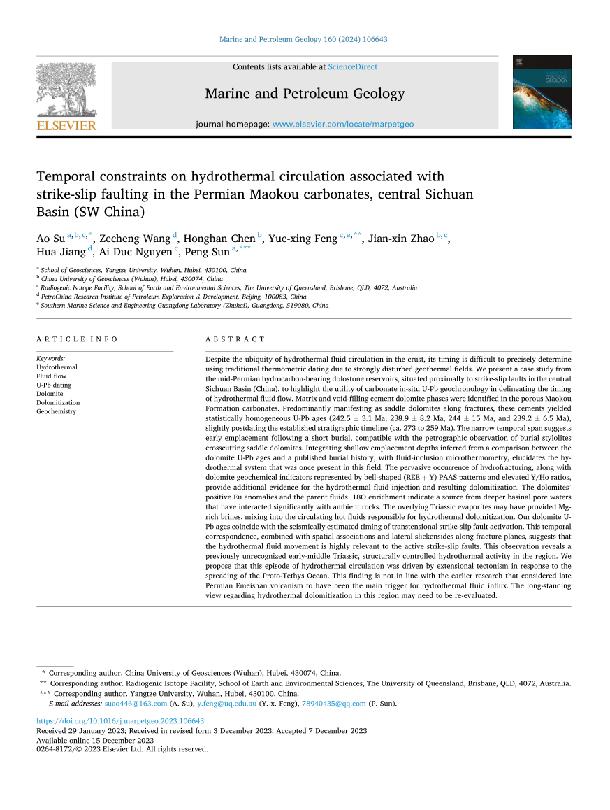 地科公司苏奥副教授在《Marine and Petroleum Geology》上发表题为“Temporal constraints on hydrothermal circulation associated with strike-slip faulting in the Permian Maokou carbonates, central Sichuan Basin (SW China)”的研究论文。英国365集团公司官网为论文第一署名单位。该论文深入探讨了构造活动作用下控制的热液活动模式,对该地区油气优势储层勘探具有一些参考意义。