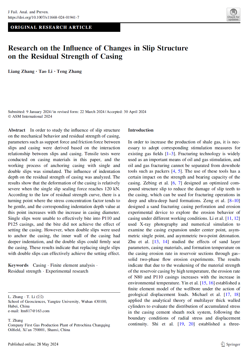 地科公司研究生张亮以通讯作者身份在EI期刊《Journal of Failure Analysis and Prevention》上发表题为“Research on the Influence of Changes in Slip Structure on the Residual Strength of Casing”的研究论文,英国365集团公司官网为论文第一署名单位,研究生张亮为第一作者,副教授李涛为论文通讯作者。