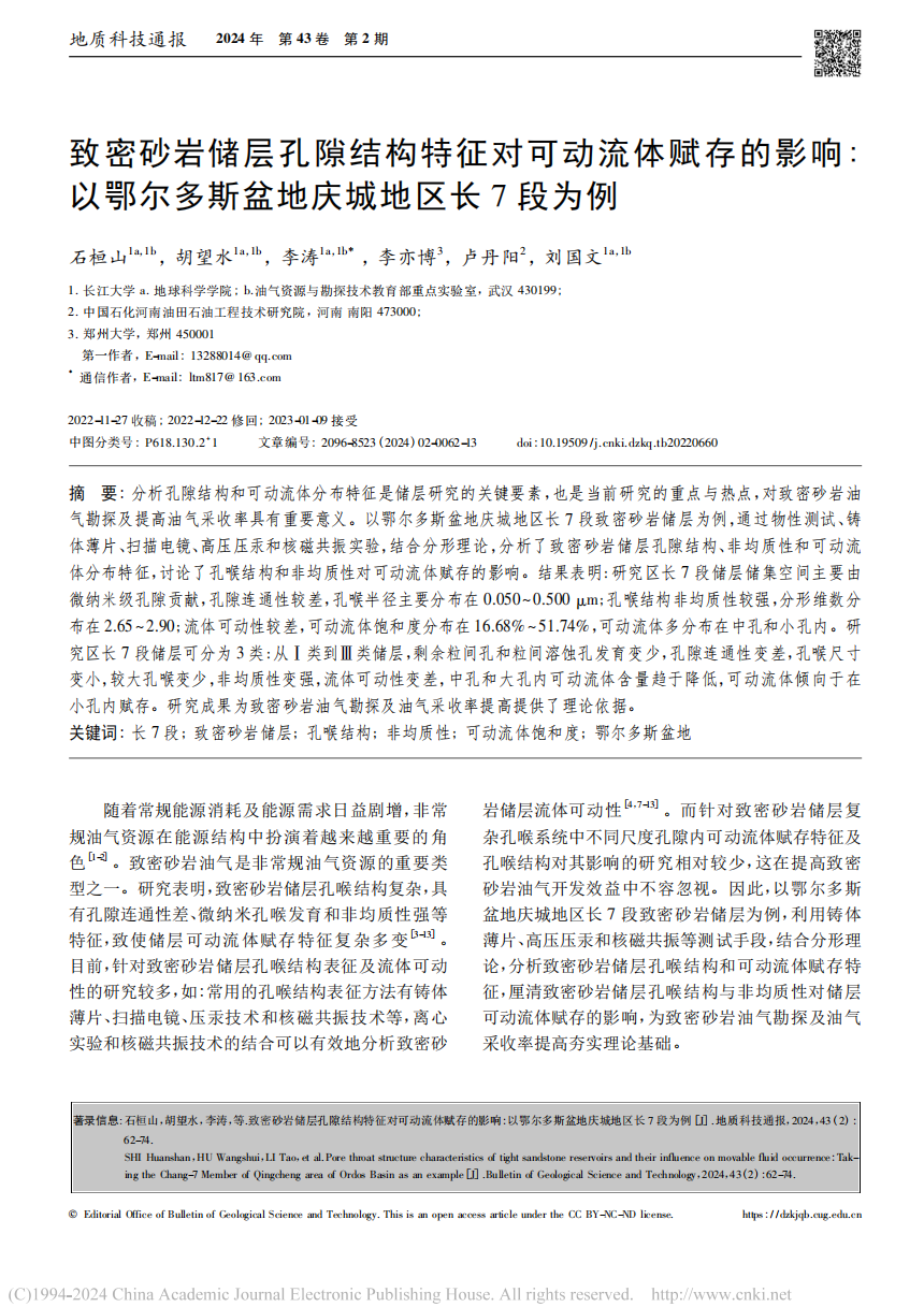 英国365集团公司官网博士生石桓山在期刊《地质科技通报》上发表题为“致密砂岩储层孔隙结构特征对可动流体赋存的影响:以鄂尔多斯盆地庆城地区长7段为例”的研究论文。英国365集团公司官网为论文第一署名单位,李涛教授为通讯作者。