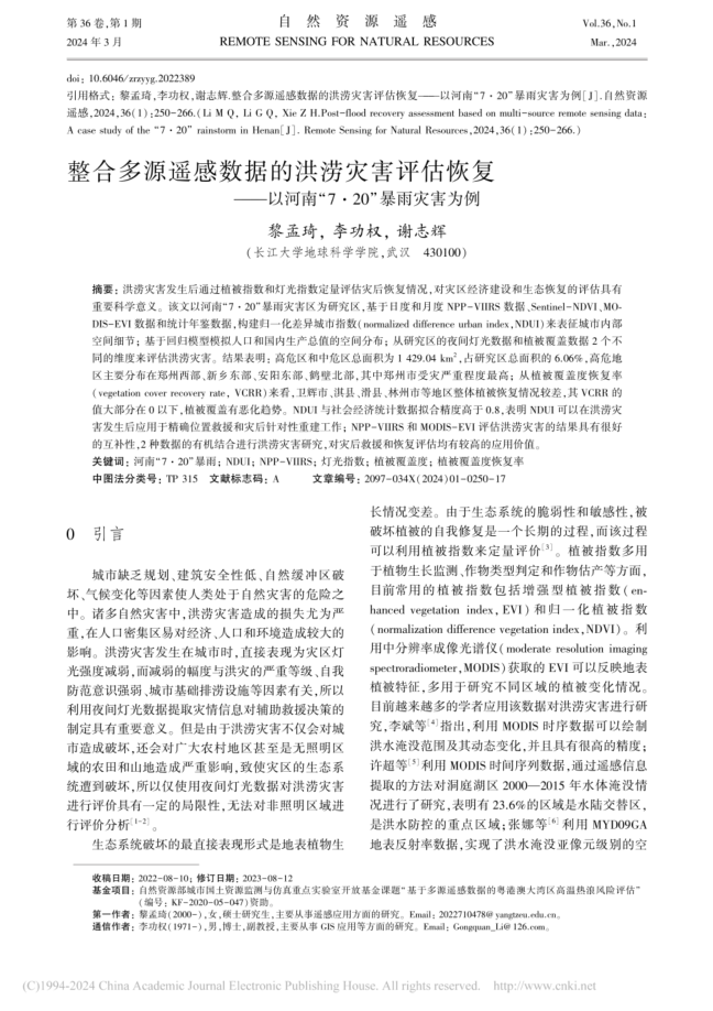 地科公司李功权课题组硕士生黎孟琦在北大核心期刊《自然资源遥感》上发表题为“整合多源遥感数据的洪涝灾害评估恢复——以河南“7·20”暴雨灾害为例”的研究论文。英国365集团公司官网为论文第一署名单位,硕士研究生黎孟琦为论文第一作者。