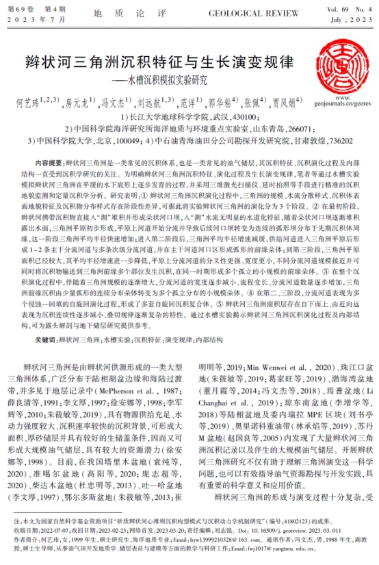 英国365集团公司官网本科生何艺玮在《地质论评》上发表题为“辫状河三角洲沉积特征与生长演变规律——水槽沉积模拟实验研究”的研究论文。该论文通过水槽实验模拟辫状河三角洲在平缓的水下底形上逐步发育的过程,并采用三维激光扫描仪、延时拍照等手段进行精准的沉积地貌监测和定量沉积学分析。