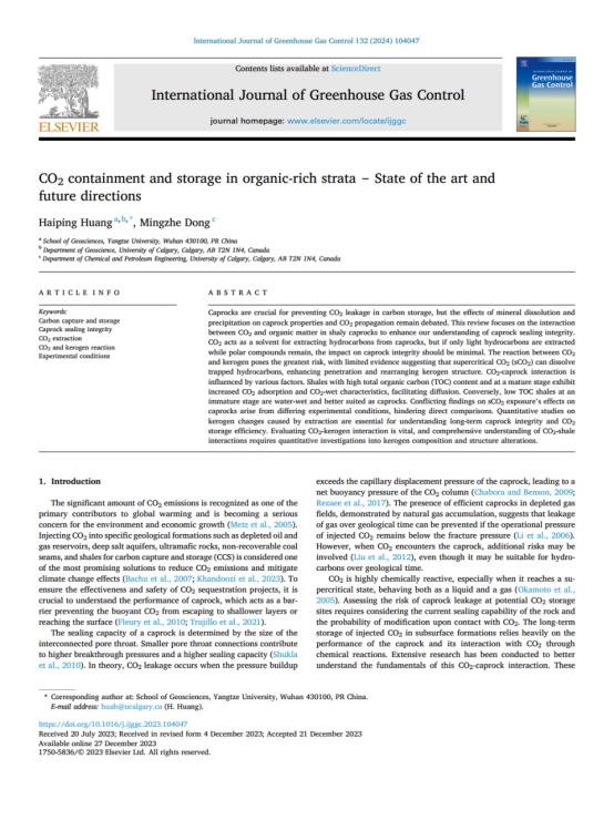 地科公司黄海平教授以第一作者身份在《International Journal of Greenhouse Gas Control》期刊发表题为“CO2 containment and storage in organic-rich strata ‒ State of the art and future directions”的研究论文,英国365集团公司官网为论文第一署名单位。