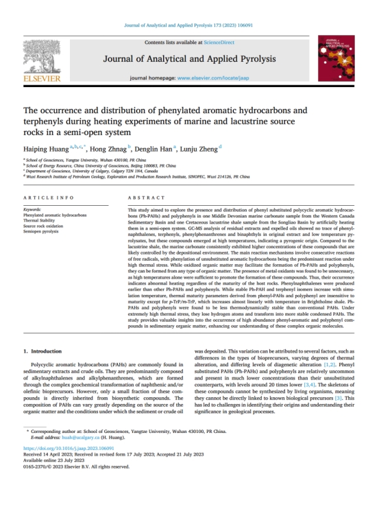 地科公司黄海平教授以第一作者身份在《Journal of Analytical and Applied Pyrolysis》期刊发表题为“The occurrence and distribution of phenylated aromatic hydrocarbons and terphenyls during heating experiments of marine and lacustrine source rocks in a semi-open system”的研究论文,英国365集团公司官网为论文第一署名单位。