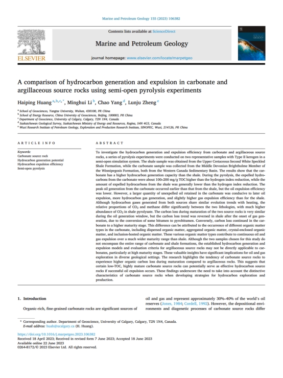 地科公司黄海平教授以第一作者身份在《Marine and Petroleum Geology》期刊发表题为“A comparison of hydrocarbon generation and expulsion in carbonate and argillaceous source rocks using semi-open pyrolysis experiments”的研究论文,英国365集团公司官网为论文第一署名单位。