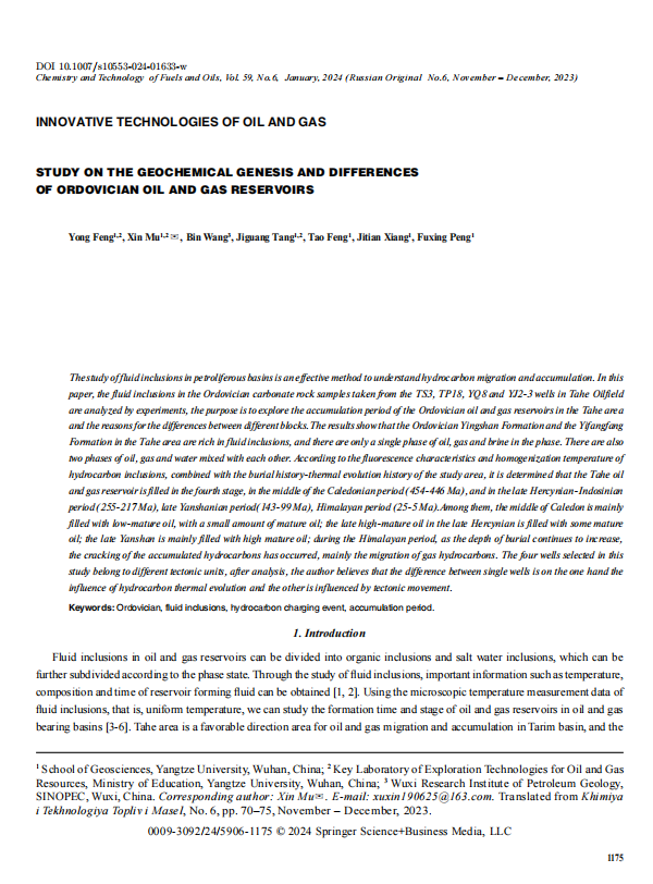 地科公司研究生母鑫以通讯作者身份在《CHEMISTRY AND TECHNOLOGY OF FUELS AND OILS》上发表题为“Study on the Geochemical Genesis and Differences of Ordovician Oil and Gas Reservoirs”的研究论文。对含油气盆地流体包裹体的研究,是认识油气运移和成藏的有效方法。文章通过实验对塔河油田TS3井、TP18井、YQ8井和YJ2-3井随钻取出的奥陶系碳酸盐岩地层样品中的流体包裹体进行分析,旨在探究塔河地区奥陶系油气藏的成藏期次及不同区块之间存在差异的原因。结果表明:塔河地区奥陶系鹰山组和一间房组地层流体包裹体种类丰富,相态上既有油、气、盐水单一相,同样存在油、气、水的两相或多相。根据烃类包裹体的荧光特性和均一温度,结合研究区的埋藏史-热演化史分析确定出塔河油田油气藏为4期充注,分别是加里东中期(454-446Ma)、海西晚期-印支期(255-217Ma)、燕山晚期(143-99Ma)、喜马拉雅期(25-5Ma)。其中加里东中期主要为低熟油充注,夹少量成熟油;海西晚期主要高熟油,夹部分成熟油的充注;燕山晚期主要是高熟油的充注;喜马拉雅期随着埋深的不断增加,发生油气藏的裂解,主要是气烃的活动。本次研究所选的4口井属于不同的构造单元,经过分析笔者认为单井之间的差异一方面是烃类热演化程度的影响,另一方面是受构造运动的影响。