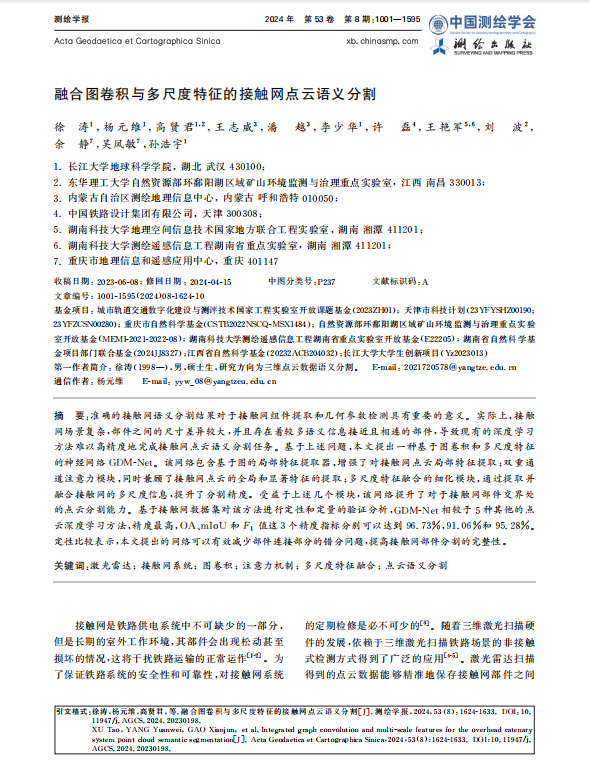 地科公司硕士生徐涛在测绘领域主流期刊《测绘学报》上发表题为“融合图卷积与多尺度特征的接触网点云语义分割”的研究论文。
