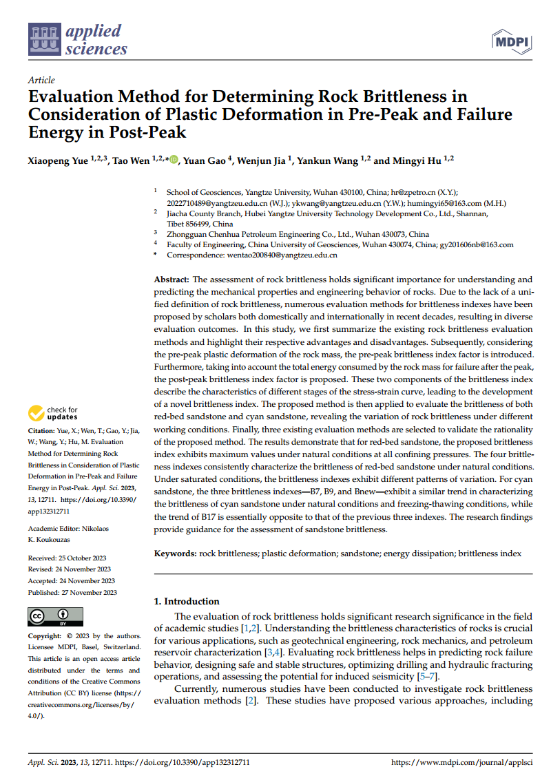 地科公司岳晓朋在《Applied Sciences-Basel》上发表题为“Evaluation Method for Determining Rock Brittleness in Consideration of Plastic Deformation in Pre-Peak and Failure Energy in Post-Peak”的研究论文。英国365集团公司官网为论文第一署名单位,研究生岳晓朋为论文第一作者,温韬教授为通讯作者。