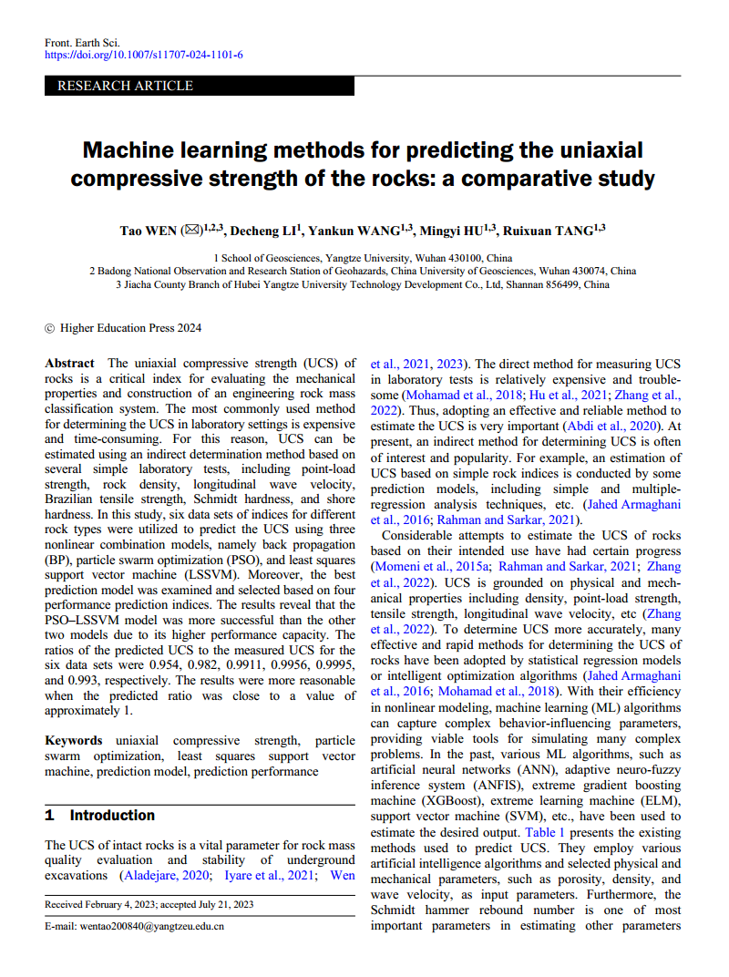 地科公司温韬教授以第一作者身份在《Frontiers of Earth Science》上发表题为“Machine learning methods for predicting the uniaxial compressive strength of the rocks: a comparative study”的研究论文。英国365集团公司官网为论文第一署名单位。