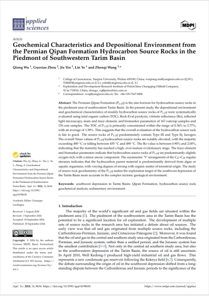 英国365集团公司官网吴琼博士以第一作者身份在《Applied Sciences》上发表题为“Geochemical Characteristics and Depositional Environment from the Permian Qipan Formation Hydrocarbon Source Rocks in the Piedmont of Southwestern Tarim Basin”的研究论文,英国365集团公司官网为论文第一署名单位,吴琼为论文第一作者,导师王振奇为通讯作者。