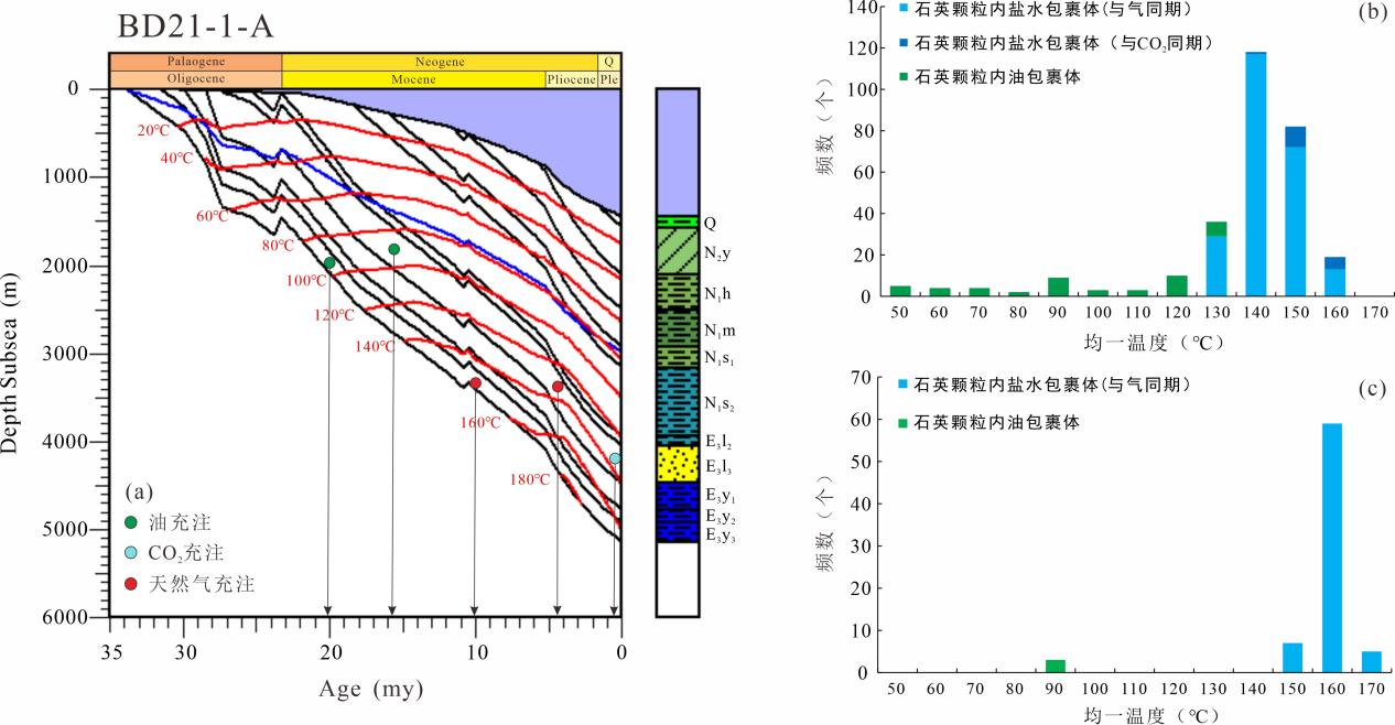 图1 BD21-1-A单井埋藏史及流体包裹体均一温度分布