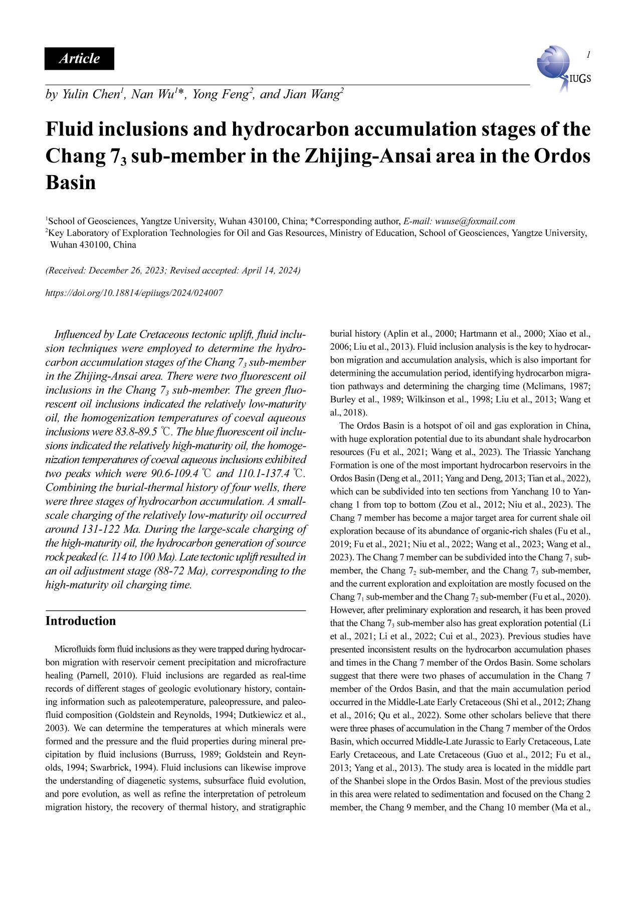 地科公司硕士生陈雨霖在《EPISODES》上发表题为“Fluid inclusions and hydrocarbon accumulation stages of the Chang 73 sub-member in the Zhijing-Ansai area in the Ordos Basin”的研究论文。英国365集团公司官网为论文第一署名单位,硕士生陈雨霖为论文第一作者,教师吴楠为通讯作者。