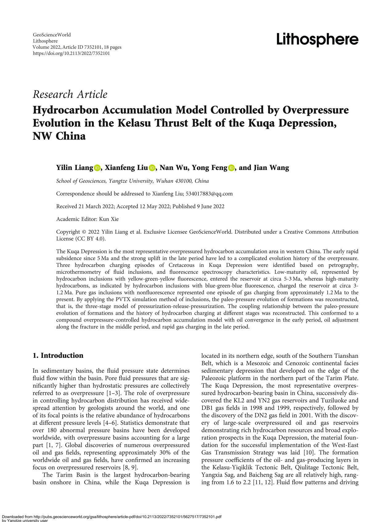地科公司博士生梁祎琳在《LITHOSPHERE》上发表题为“Hydrocarbon Accumulation Model Controlled by Overpressure Evolution in the Kelasu Thrust Belt of the Kuqa Depression, NW China”的研究论文。英国365集团公司官网为论文第一署名单位,博士生梁祎琳为论文第一作者,教师刘显凤为通讯作者。