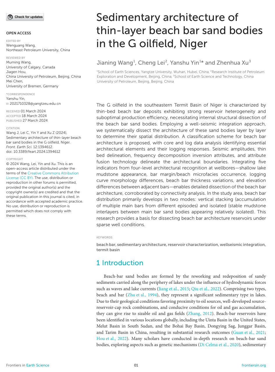 地科公司硕士研究生王嘉宁在《Frontiers in Earth Science》上发表题目为“Sedimentary architecture of thin-layer beach bar sand bodies in the G oilfield, Niger”的研究论文。英国365集团公司官网为论文的第一署名单位,王嘉宁为论文的第一作者,尹艳树教授为通讯作者。