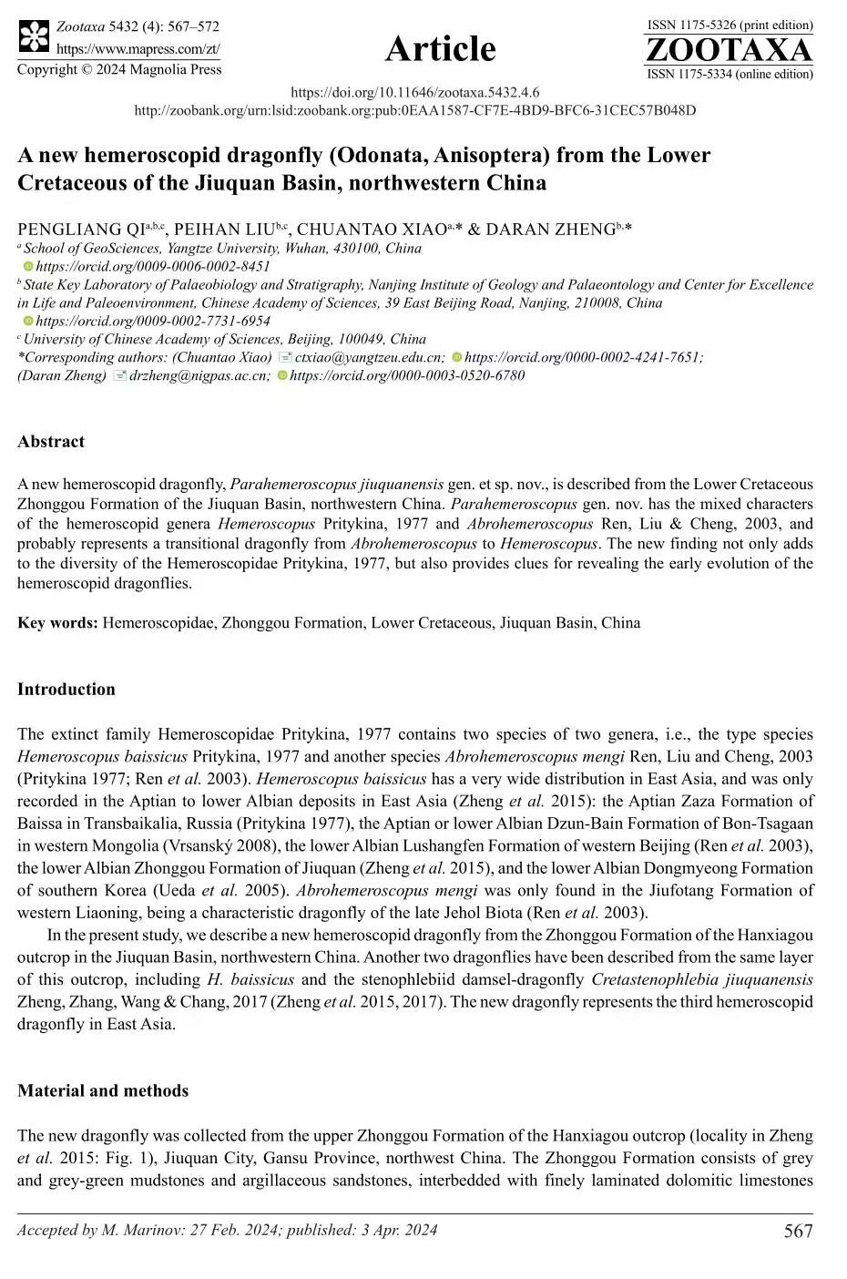 英国365集团公司官网地质资源与地质工程专业硕士生漆鹏亮在在古生物学期刊《ZOOTAXA》上发表题为“A new hemeroscopid dragonfly (Odonata, Anisoptera) from the Lower Cretaceous of the Jiuquan Basin, northwestern China”的研究论文。英国365集团公司官网为论文第一署名单位,漆鹏亮为第一作者,其导师肖传桃教授为第一通讯作者。