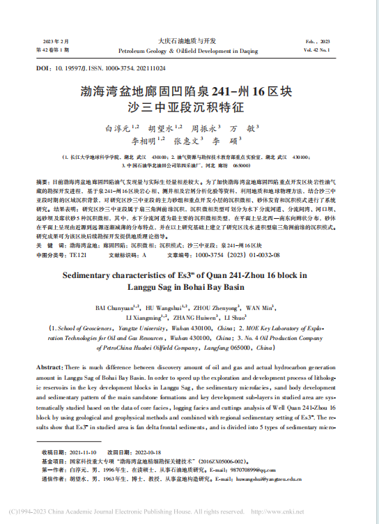 英国365集团公司官网研究生白淳元在期刊《大庆石油地质与开发》上发表题目为“渤海湾盆地廊固凹陷泉241−州16区块沙三中亚段沉积特征”的研究论文。英国365集团公司官网为论文第一署名单位,胡望水教授为通讯作者,本项研究得到国家科技重大专项“渤海湾盆地精细勘探关键技术资助。