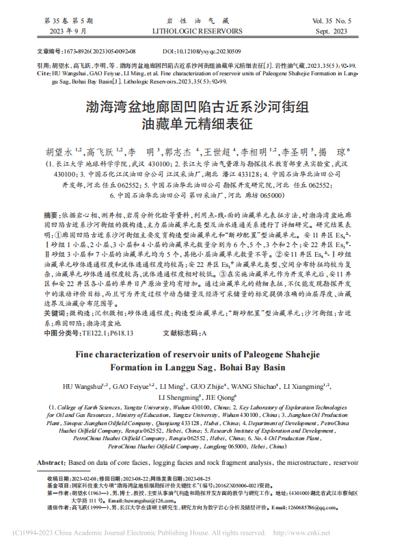 英国365集团公司官网胡望水教授以第一作者身份在《岩性油气藏》权威期刊上发表题为“渤海湾盆地廊固凹陷古近系沙河街组油藏单元精细表征”的研究论文,高飞跃硕士为通讯作者。该项研究得到了国家科技重大专项“渤海湾盆地精细勘探评价关键技术的资助。