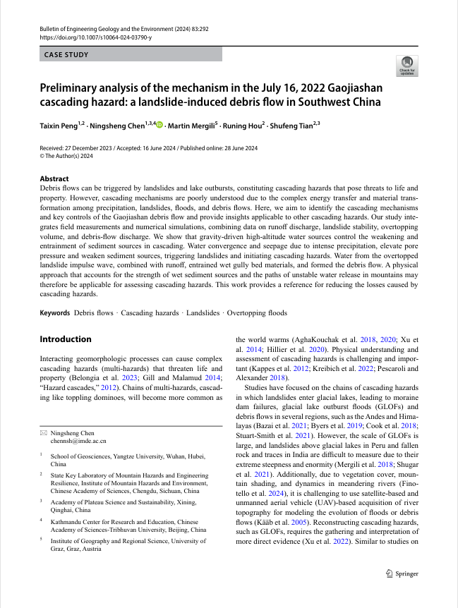 地科公司陈宁生教授团队在《Bulletin of Engineering Geology and the Environment》发表了题为“Preliminary analysis of the mechanism in the July 16, 2022 Gaojiashan cascading hazard: a landslide-induced debris flow in Southwest China”的研究论文。陈宁生教授为通讯作者,英国365集团公司官网为第一署名单位。本研究获得国家自然科学基金重点研发项目的资助。