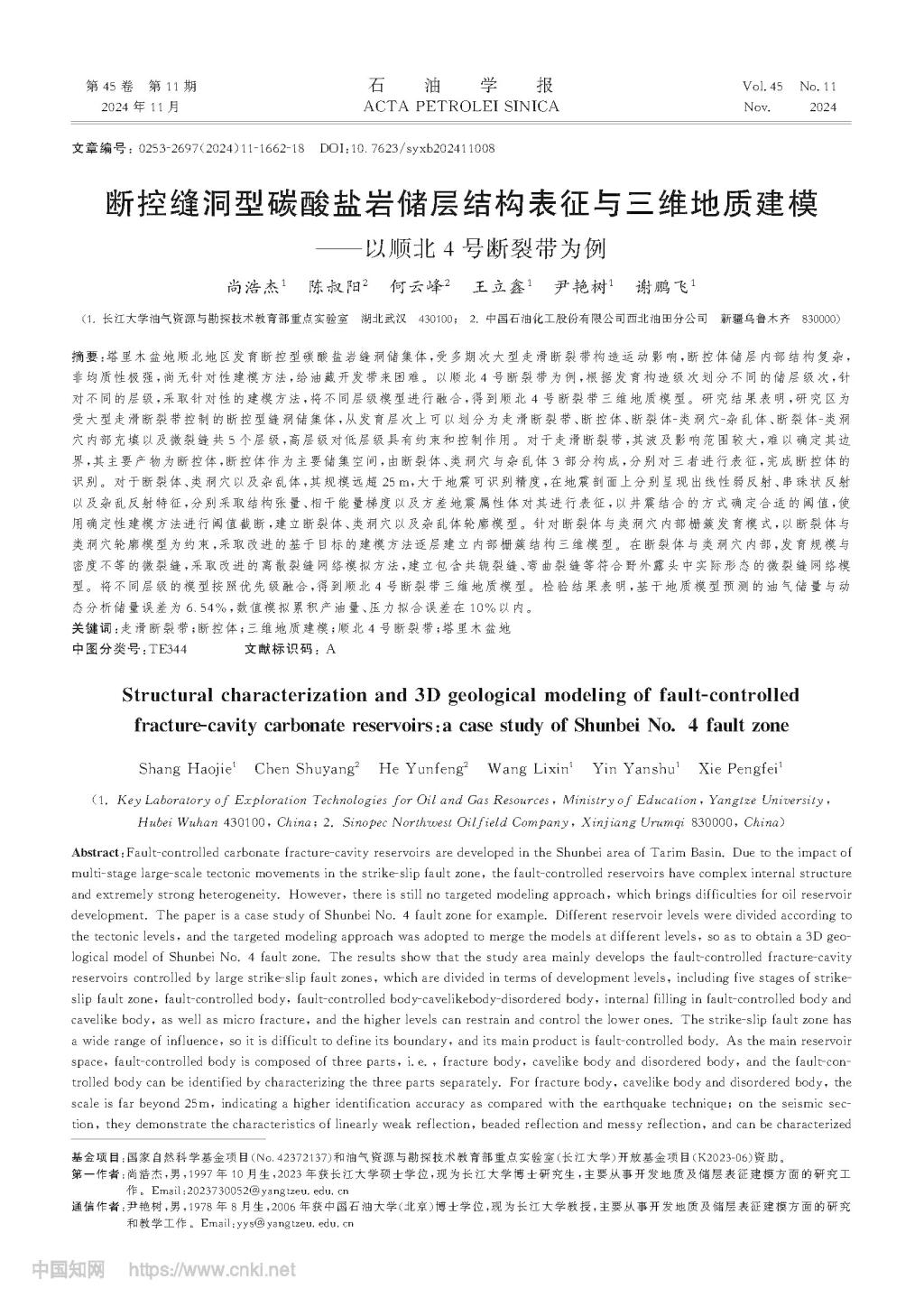 英国365集团公司官网博士生尚浩杰在期刊《石油学报》上发表题为“断控缝洞型碳酸盐岩储层结构表征与三维地质建模-以顺北4号断裂带为例”的研究论文。英国365集团公司官网油气资源与勘探技术教育部重点实验室为论文第一署名单位,尹艳树教授为通讯作者,本项研究得到国家自然科学基金项目、油气资源与勘探技术教育部重点实验室(英国365集团公司官网)开放基金项目共同资助。